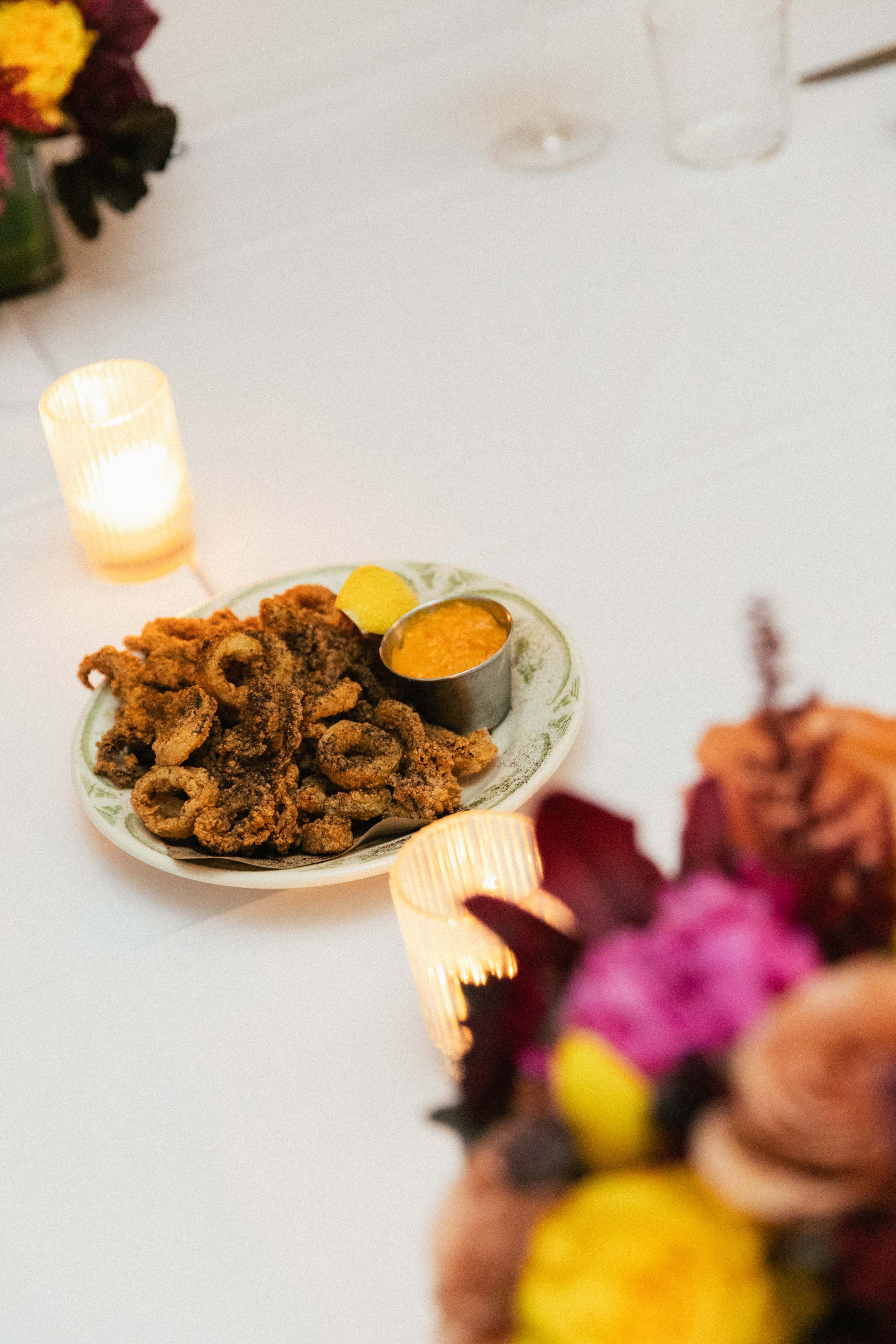 A plate of fried calamari with lemon wedge and dipping sauce, illuminated by candlelight on a white table, with a blurred flower arrangement in the foreground. View fullsize