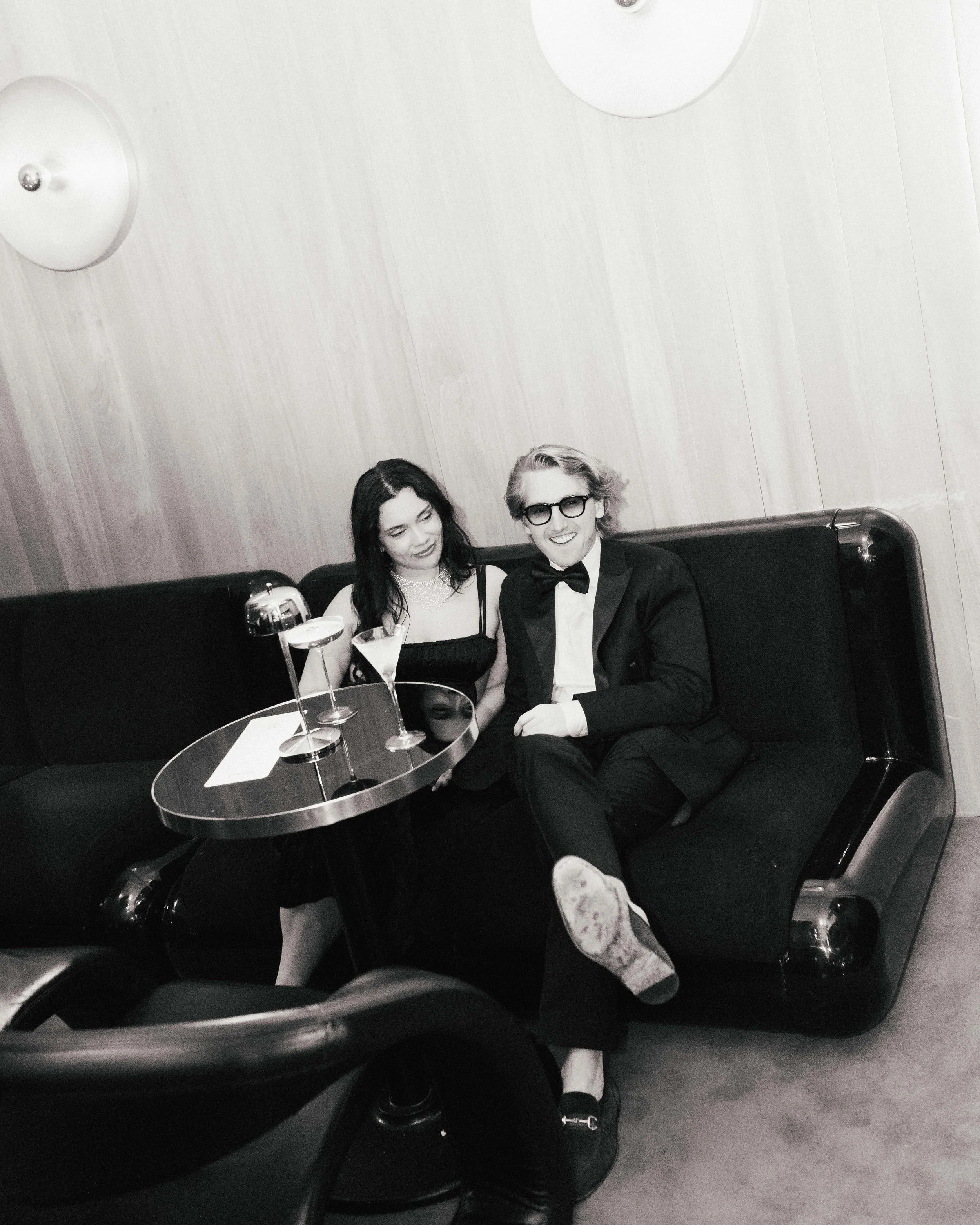Two people dressed in formal attire sitting on a black leather booth with drinks on a small round table.
