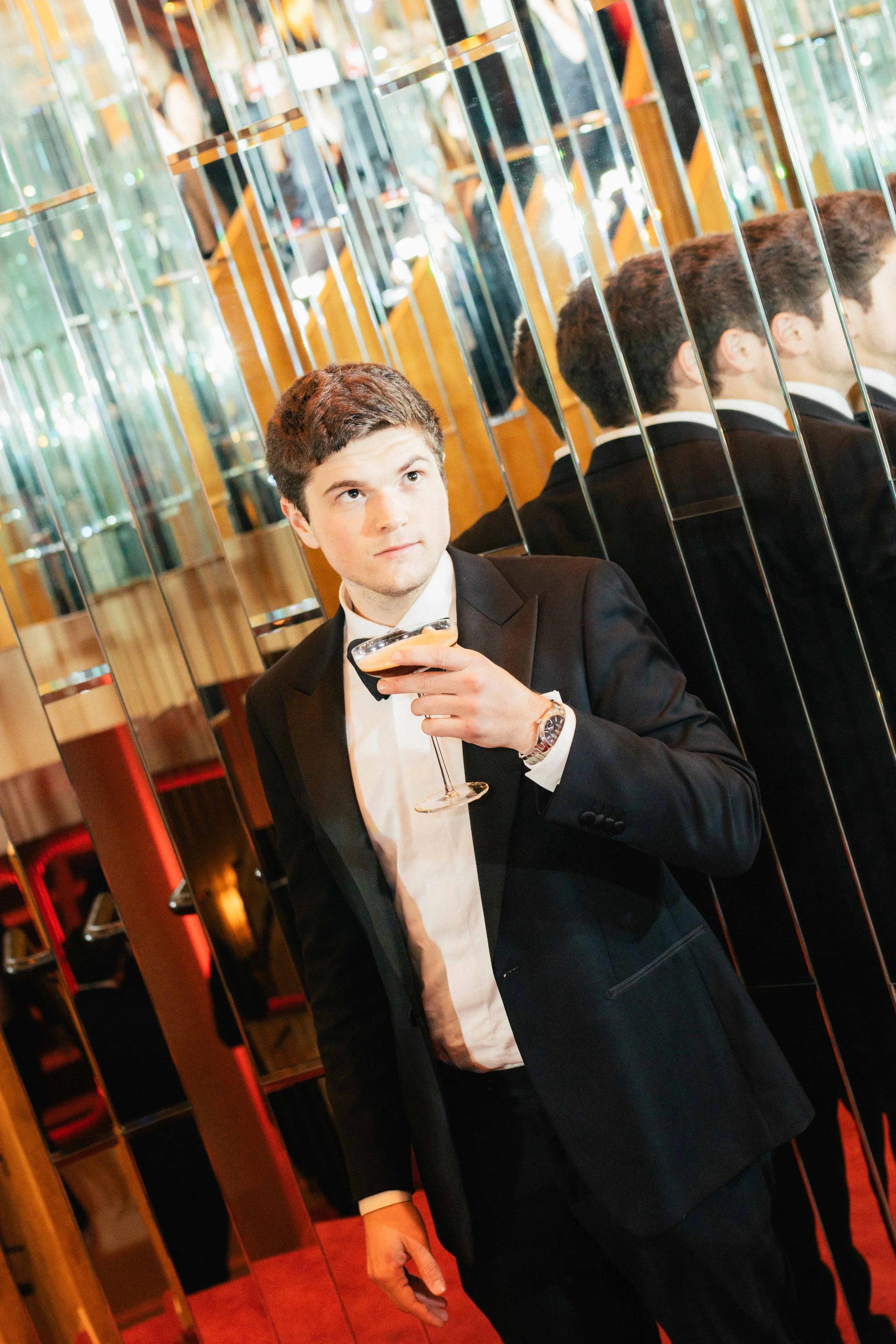 A young man in a black tuxedo with a white shirt and black bow tie holding a cocktail glass while standing in front of mirrored walls in a fancy venue.