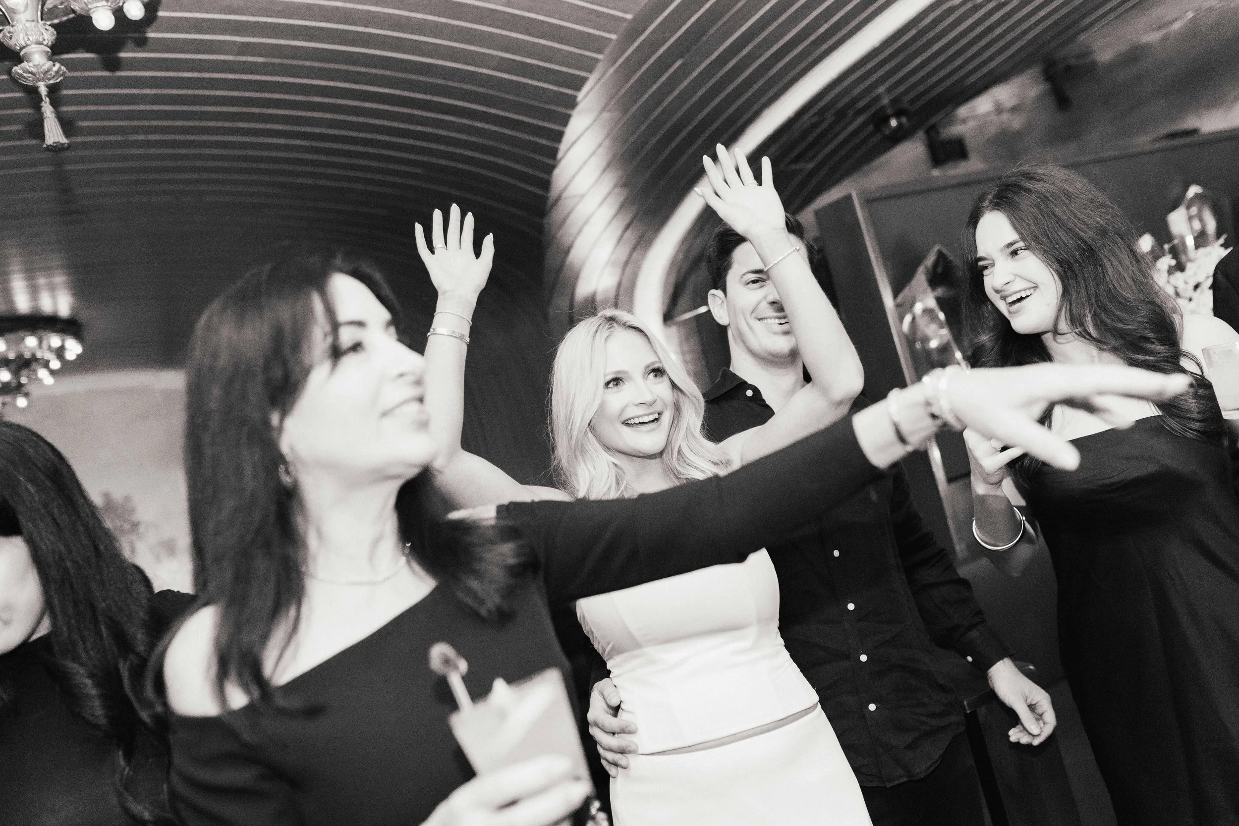 Group of five friends at a party, smiling and dancing under a curved ceiling, with one woman holding a drink.