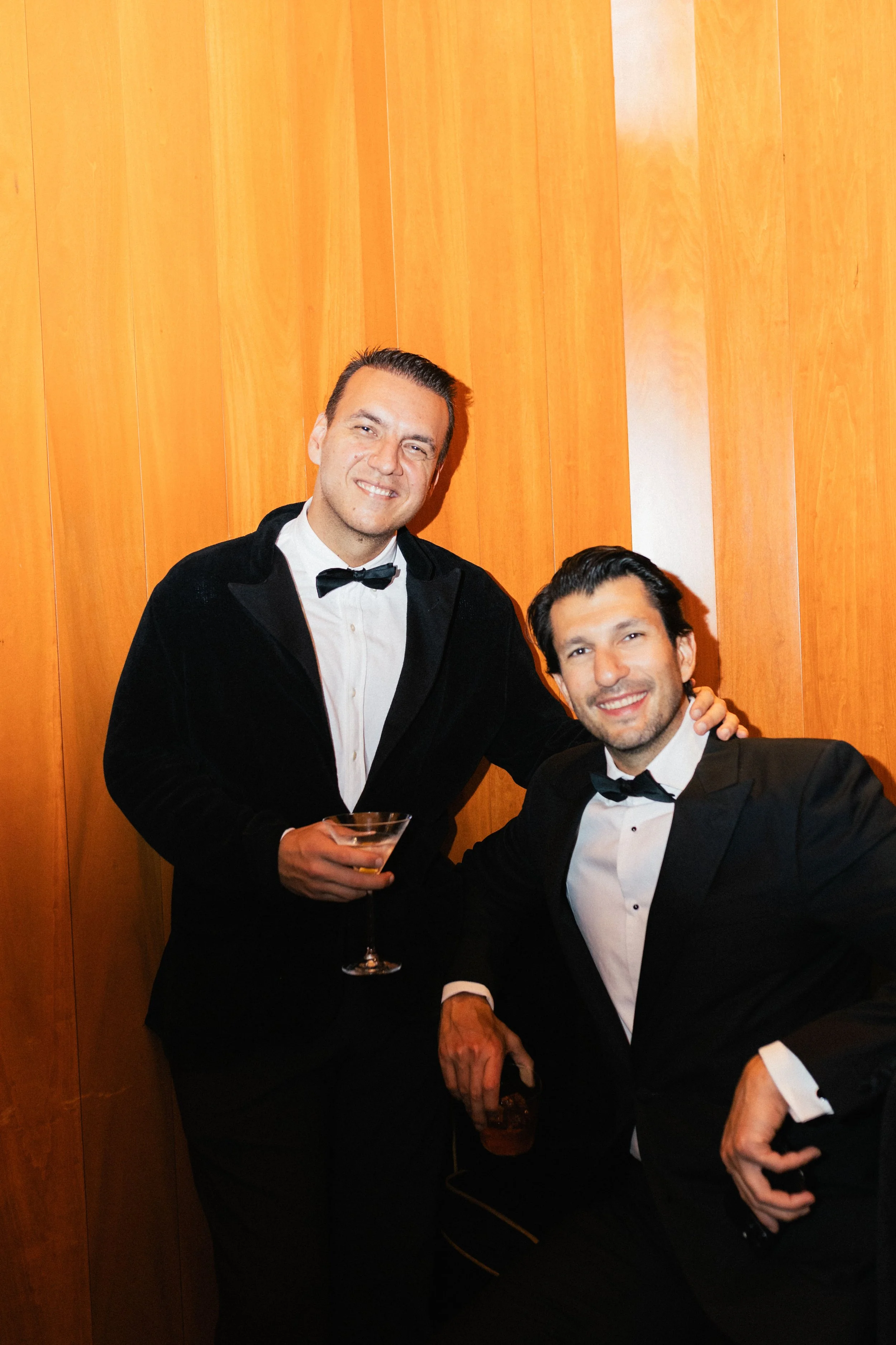 Two men in tuxedos smiling at a formal event, standing against a wooden paneled wall. One is holding a martini glass, the other has a drink in hand.
