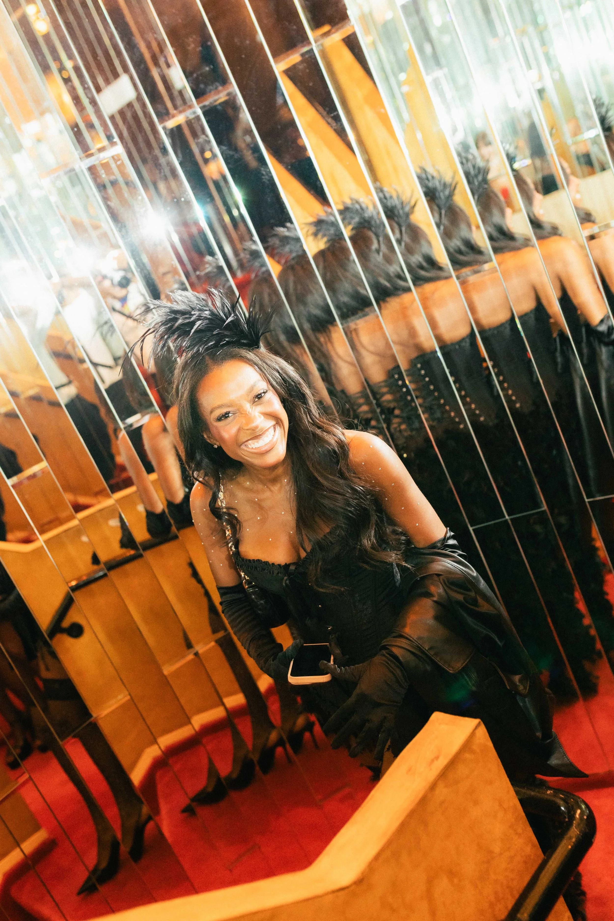 A smiling woman in a black outfit with feathered headpiece and gloves standing in front of a mirrored wall in a stylish venue.
