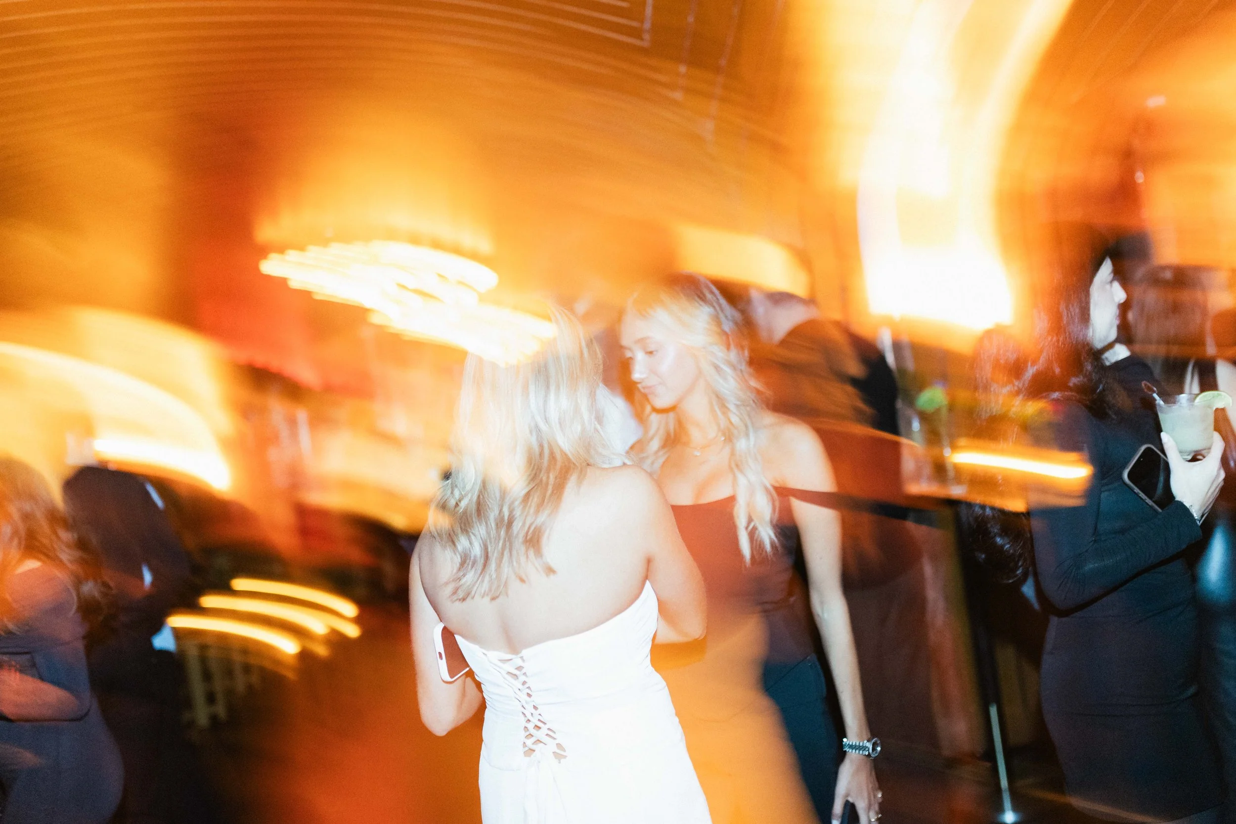 Two women with blonde hair in conversation at a lively party, with warm orange lighting and blurred motion. View fullsize