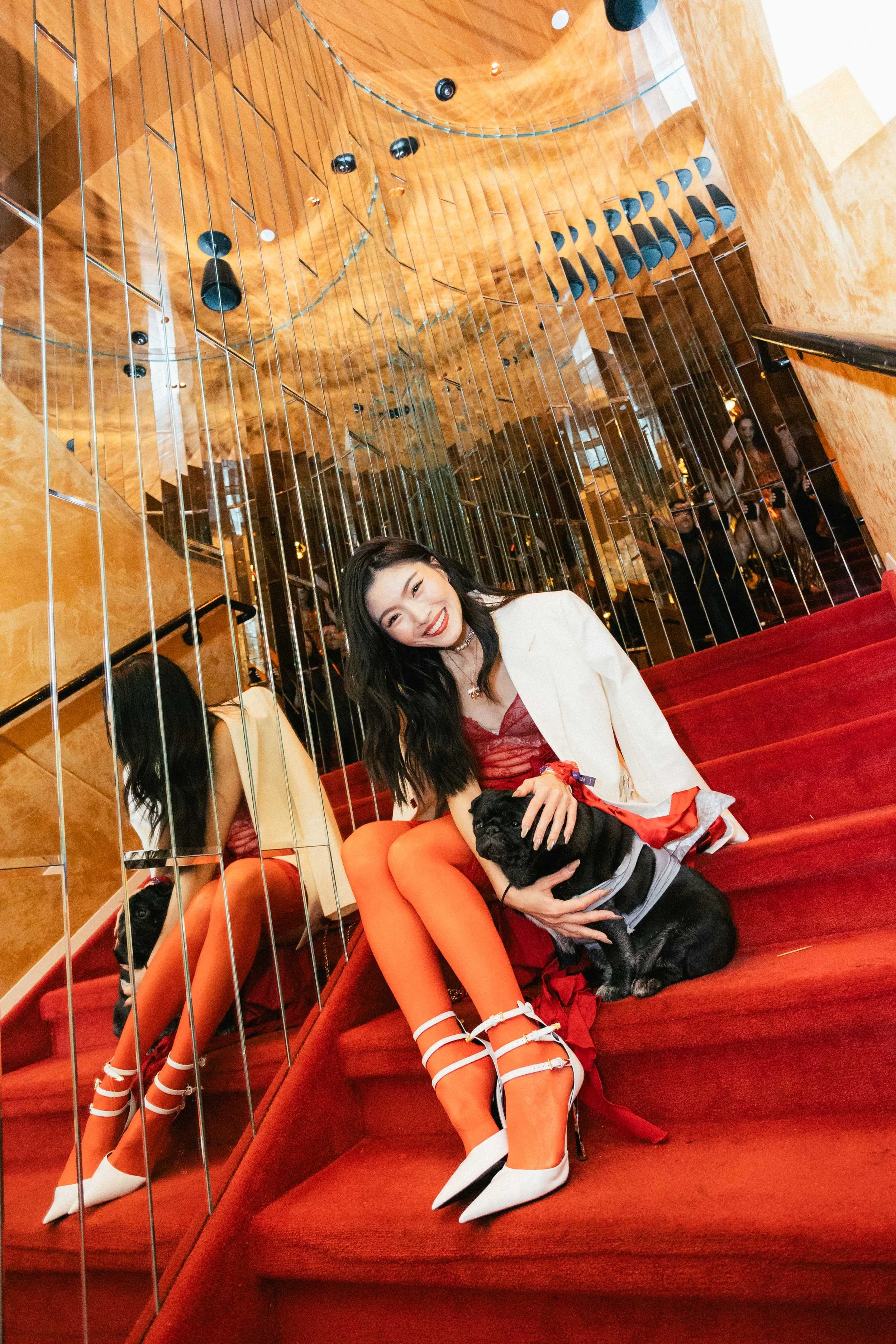 A woman sitting on a red carpeted staircase with a small black dog, smiling and looking at the camera, with mirrored walls and golden brown walls around.