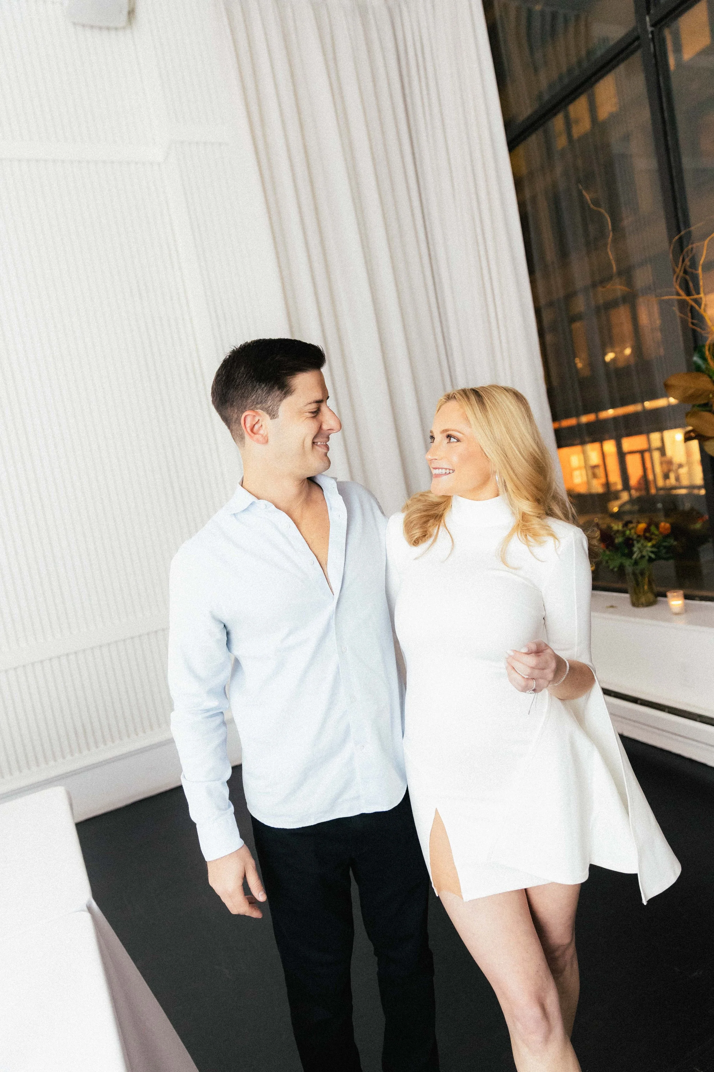 A man and woman smiling at each other indoors near a large window with a candle and flowers on the sill.