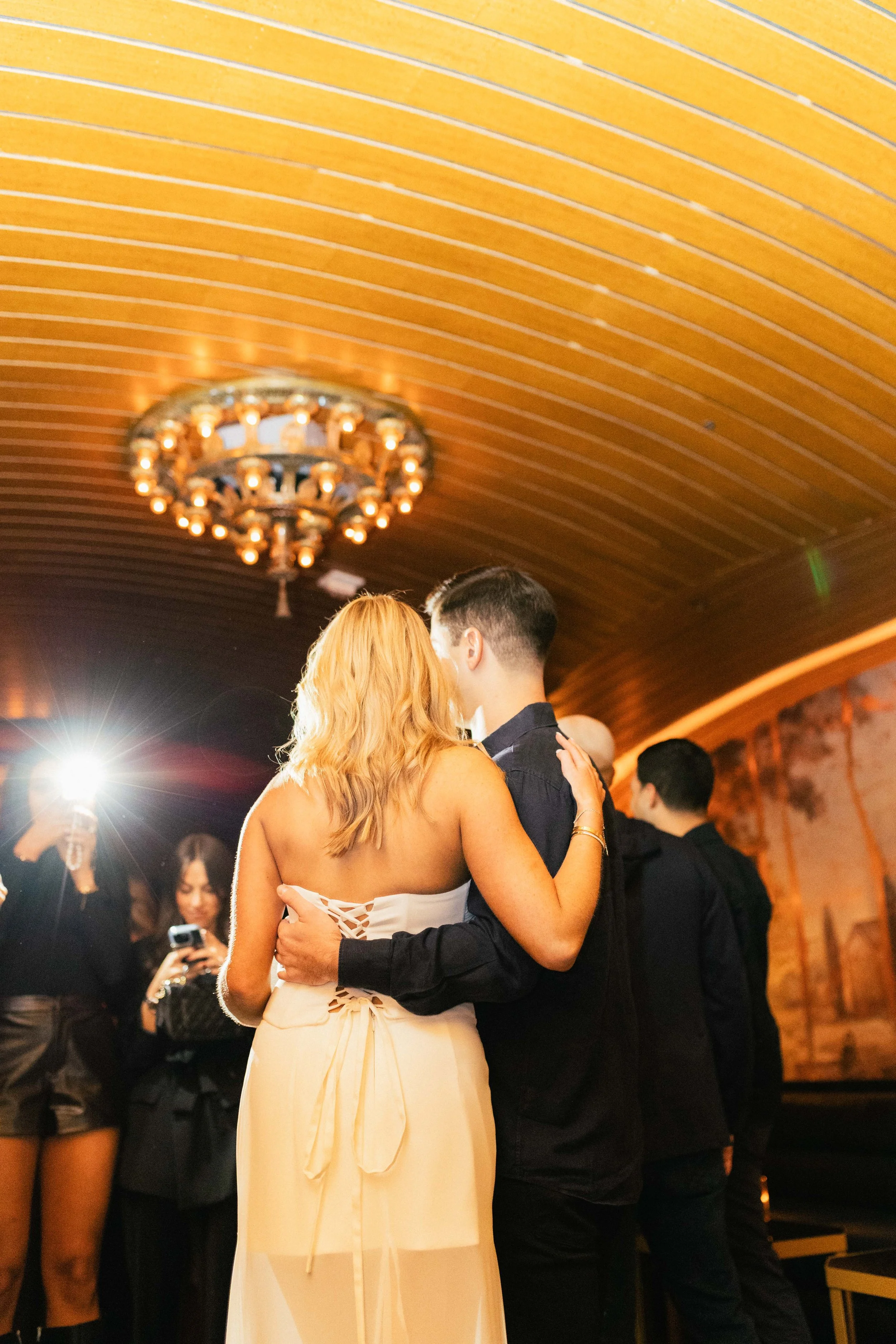 A couple dancing closely at an indoor event with a golden wooden ceiling and chandelier, while other people are visible in the background, some taking photos. View fullsize