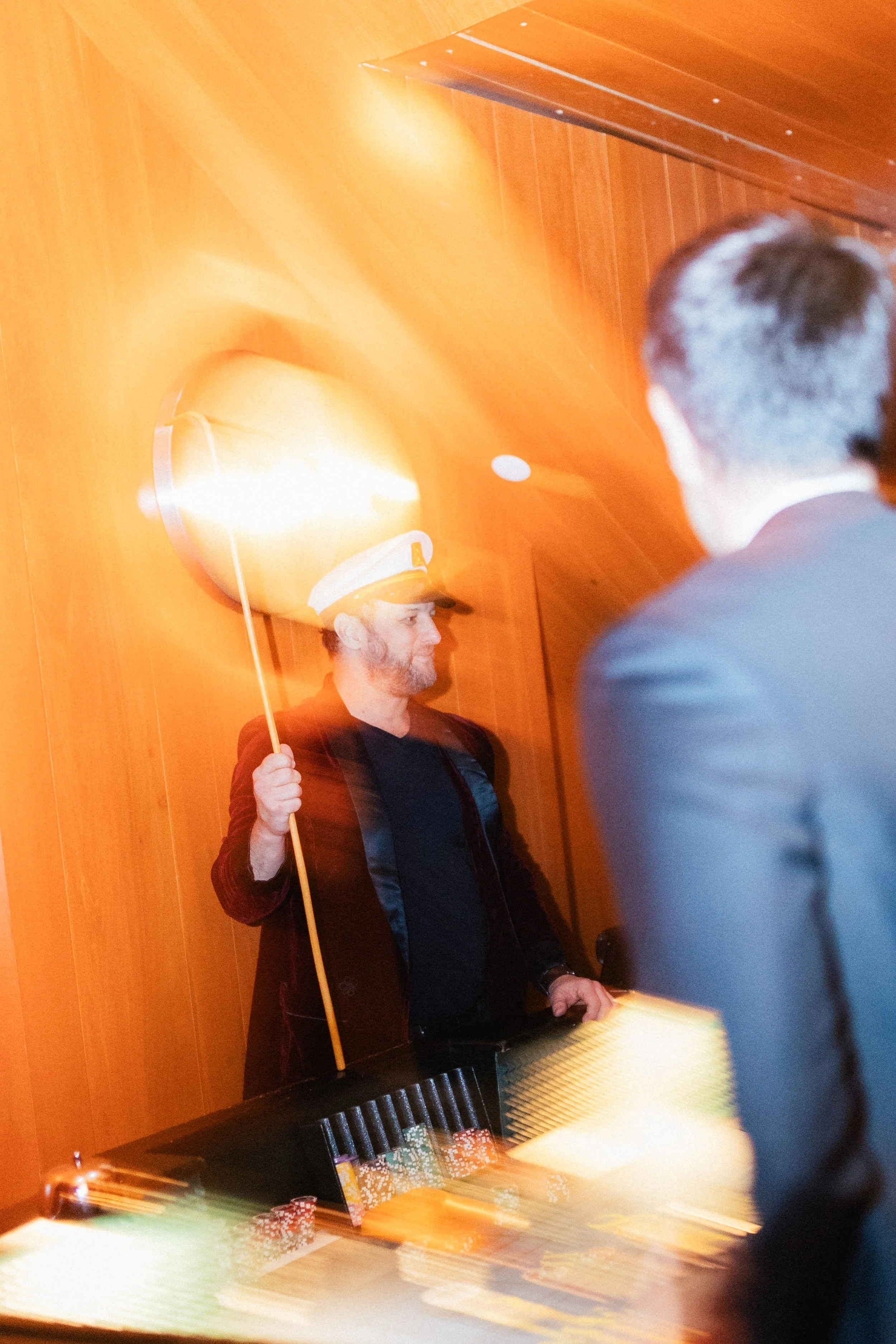 A man dressed as a captain holding a paddle in front of a fiery background, standing in front of a table of poker chips, with another person whose face is not visible.