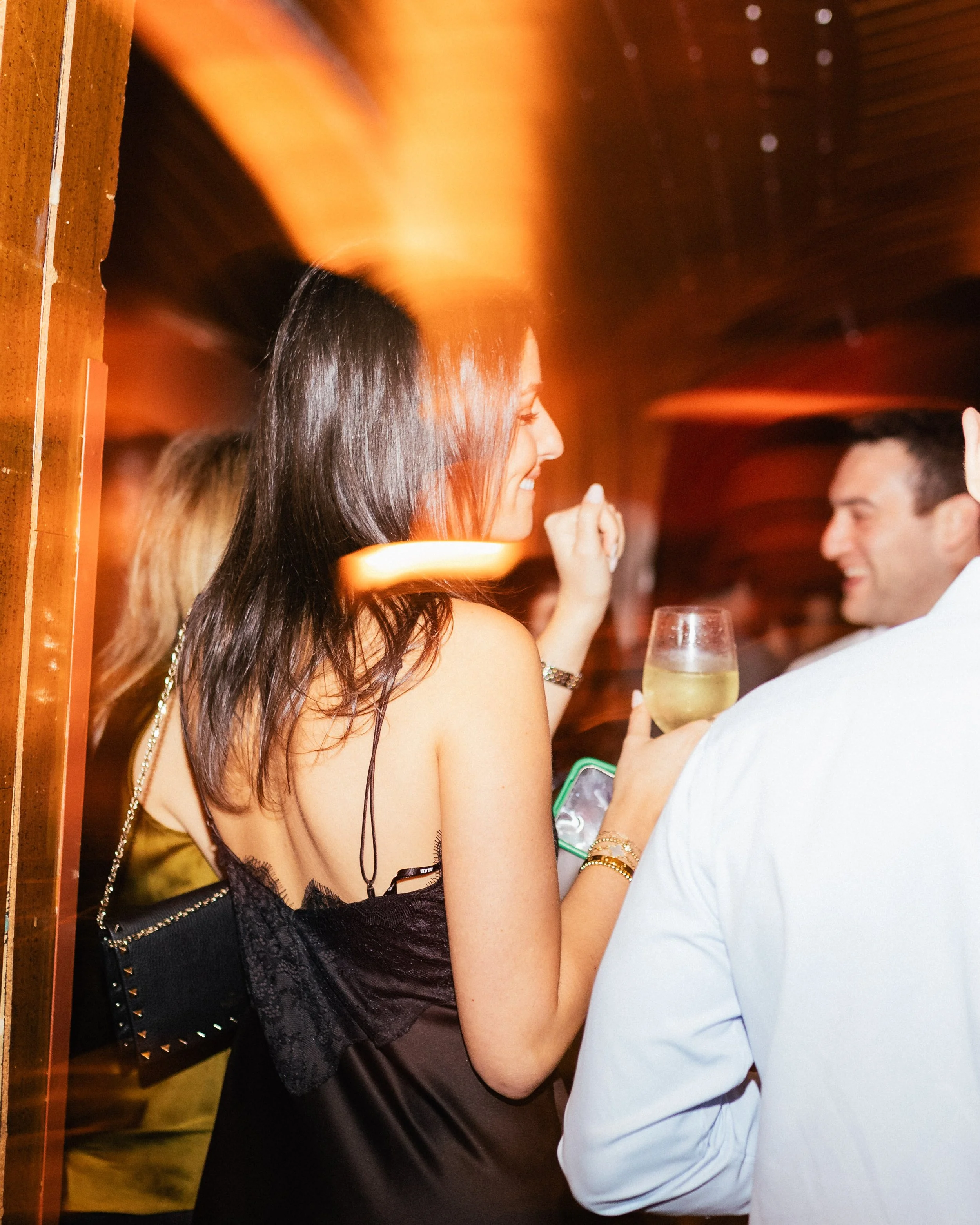 People socializing at a party or bar, with a woman in black dress holding a drink and smiling.