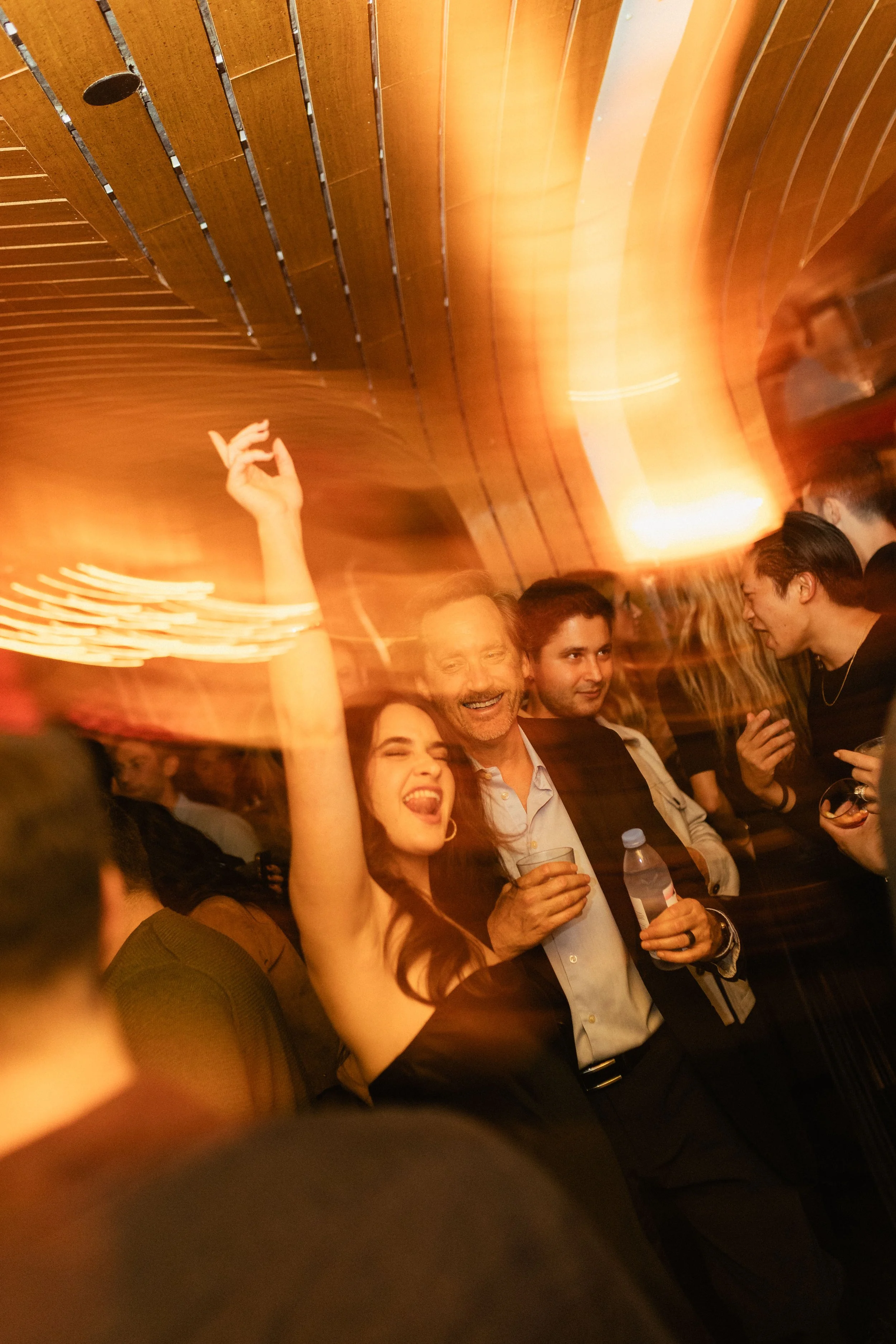 Party scene with smiling people, woman dancing with raised arm, man holding water bottle, warm lighting, wooden ceiling.