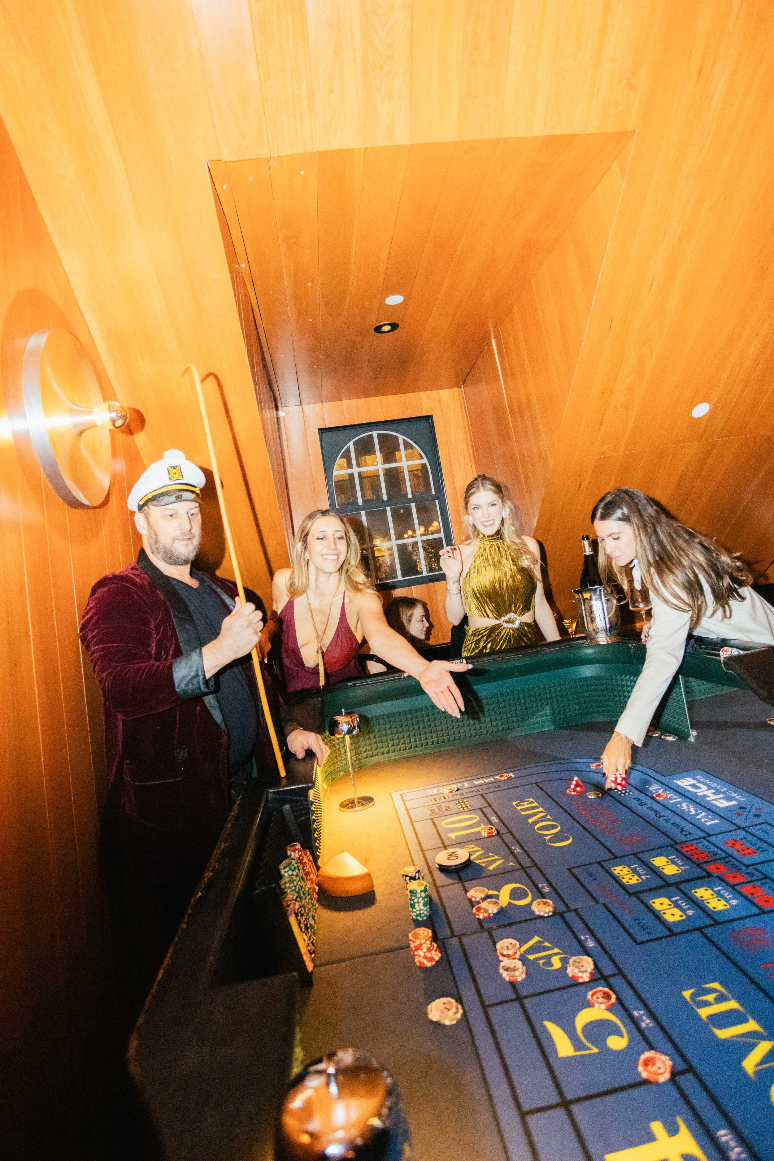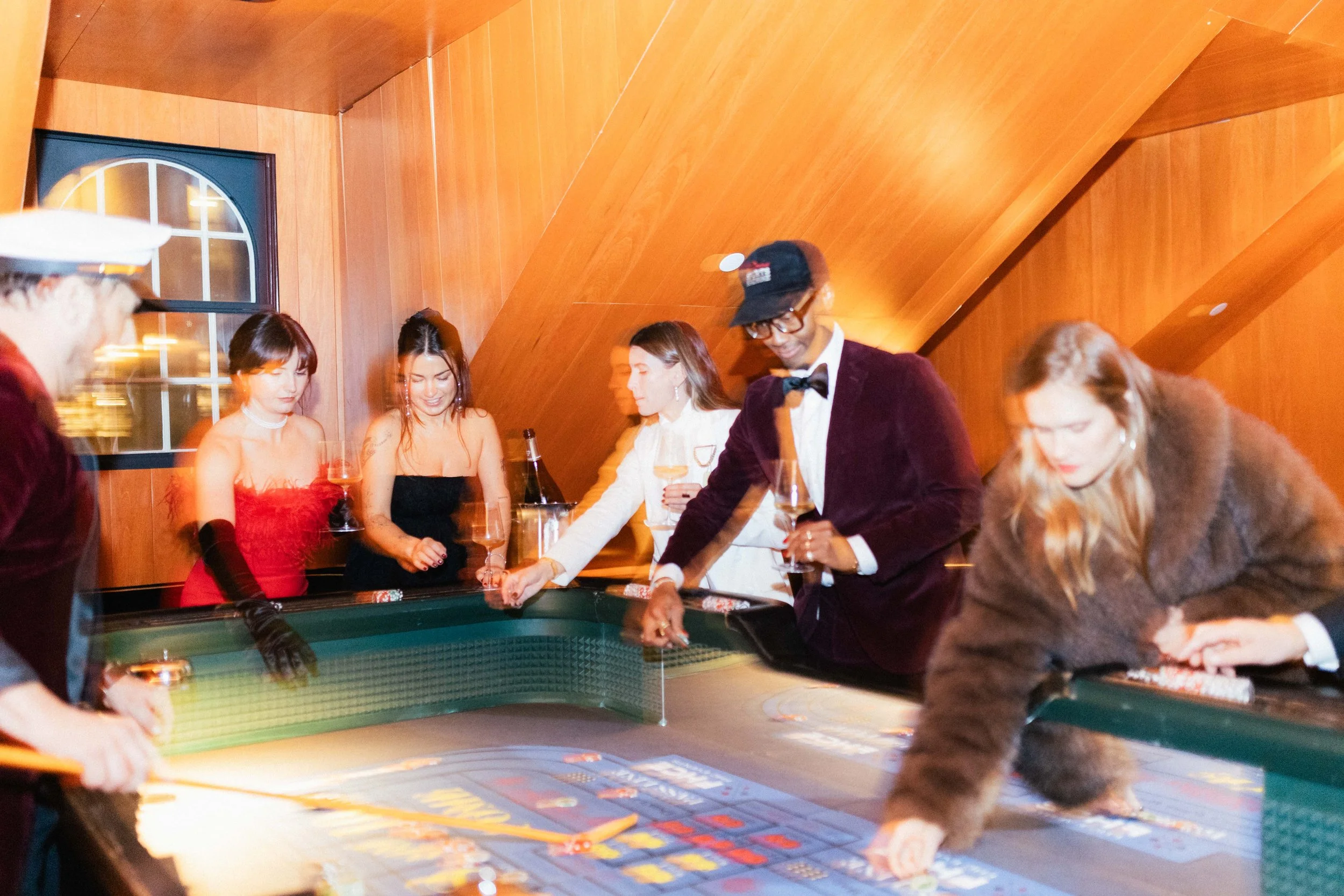 People gambling at a casino table, with some holding drinks, in a wood-paneled room.