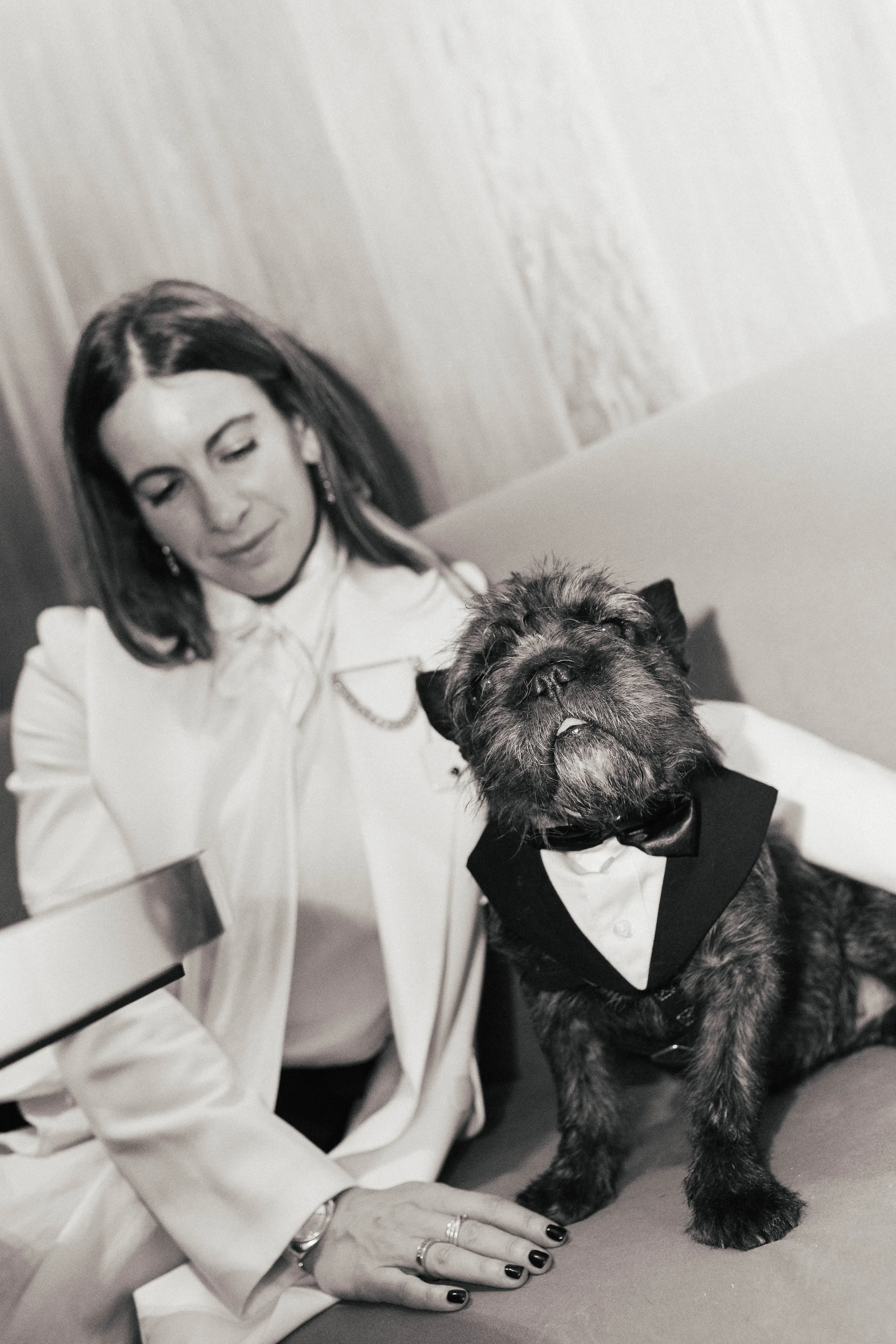 A black and white photo of a woman sitting on a couch with a small dog dressed in a tuxedo. The woman has shoulder-length hair and is wearing a white blouse with a bow tie detail. She is looking at the dog with her hand resting near the dog. View fullsize