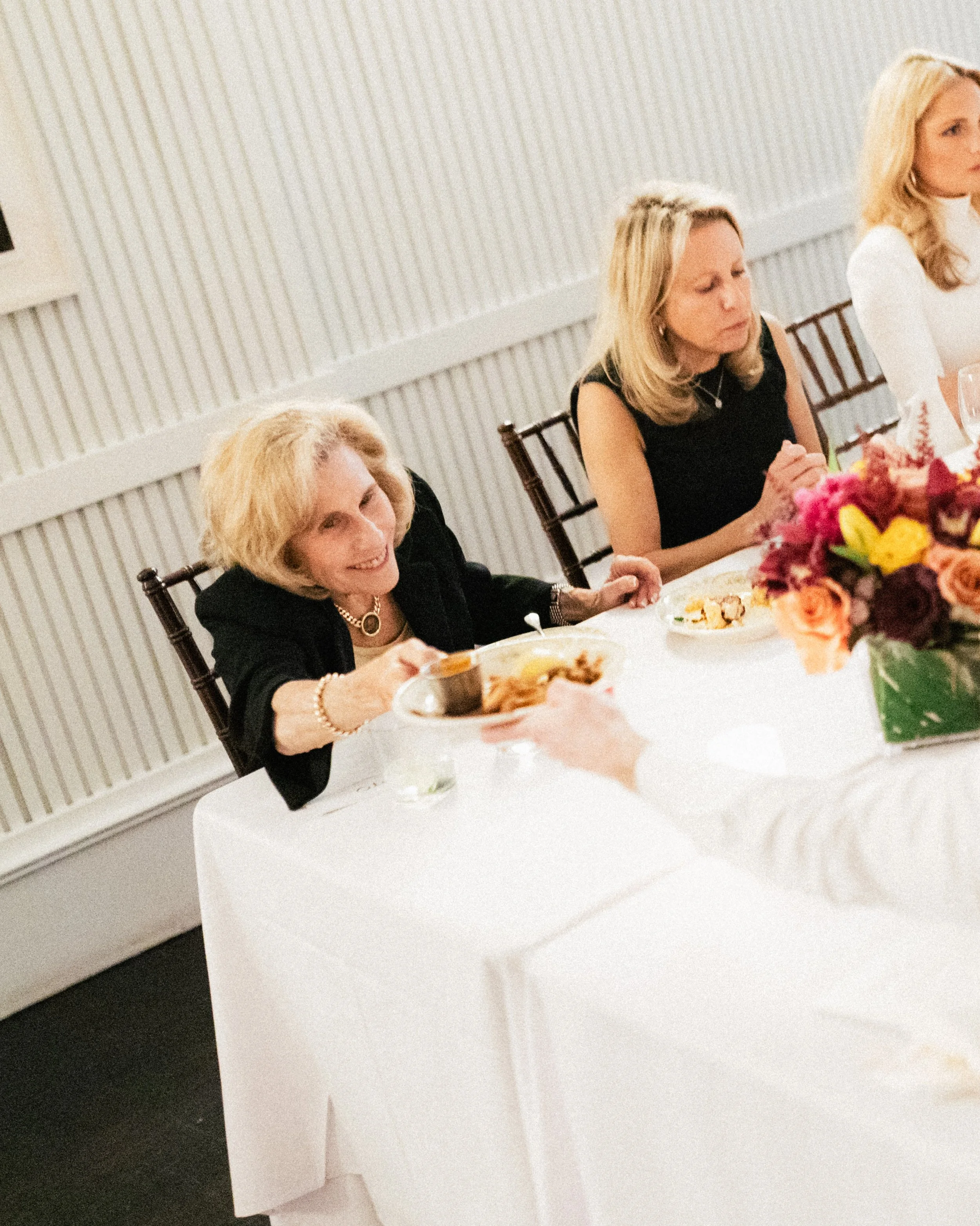 Women sitting at a dining table with a white tablecloth and a floral centerpiece.
