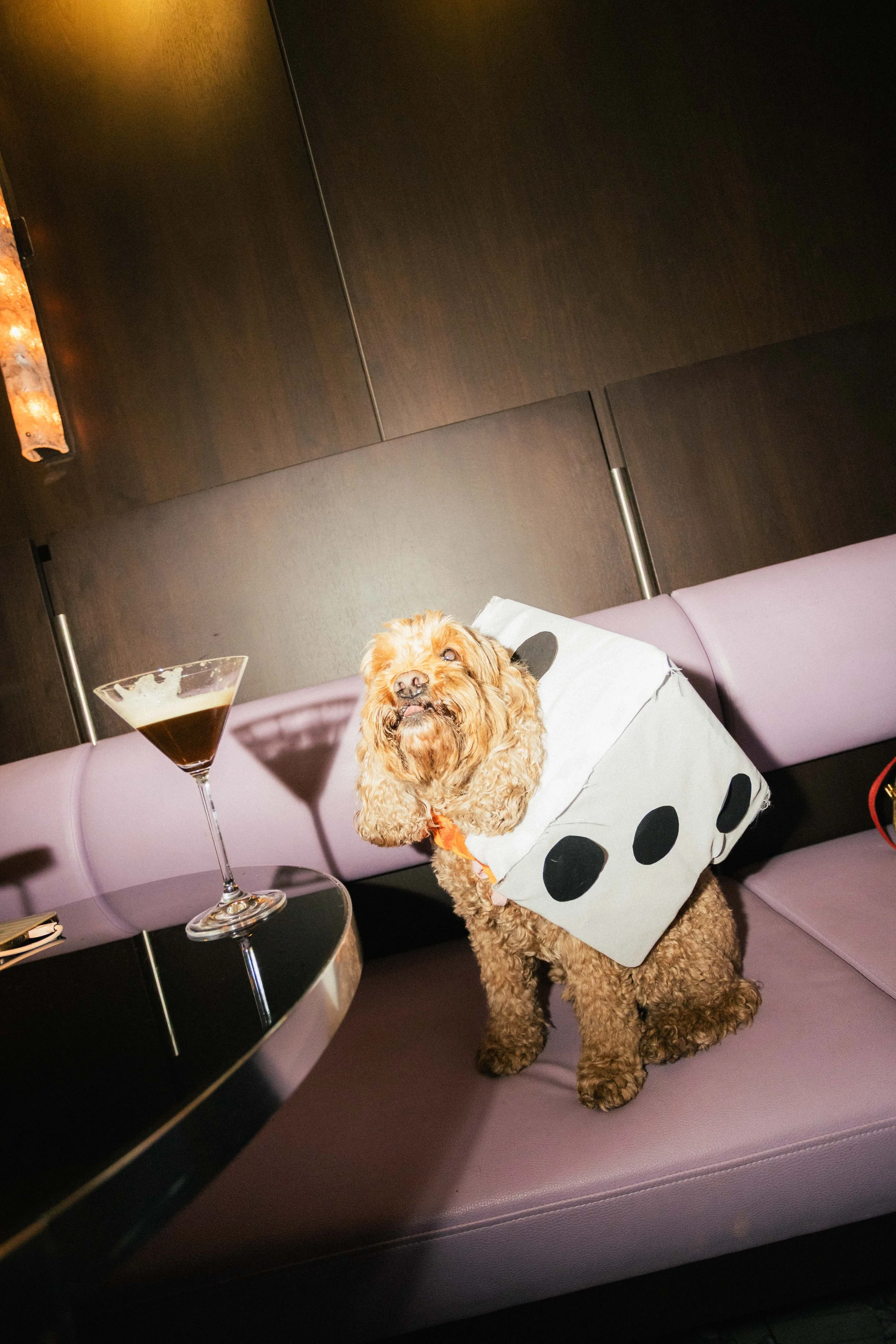 A dog dressed in a panda bear costume sitting on a pink sofa in a dimly lit room with dark wooden walls and a martini glass on the table nearby. View fullsize