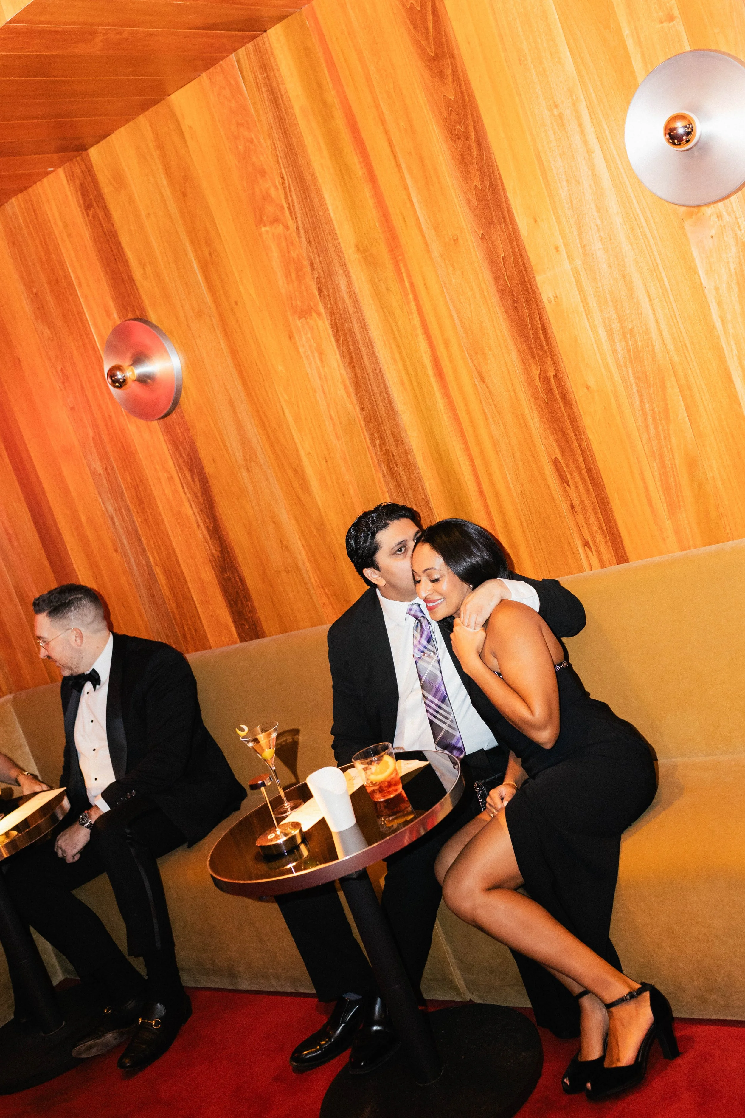 A man and woman sitting close on a couch at a bar or lounge, with drinks on a small round table, sharing a hug and smiling, while another man sits nearby looking at his phone against a wood-paneled wall. View fullsize
