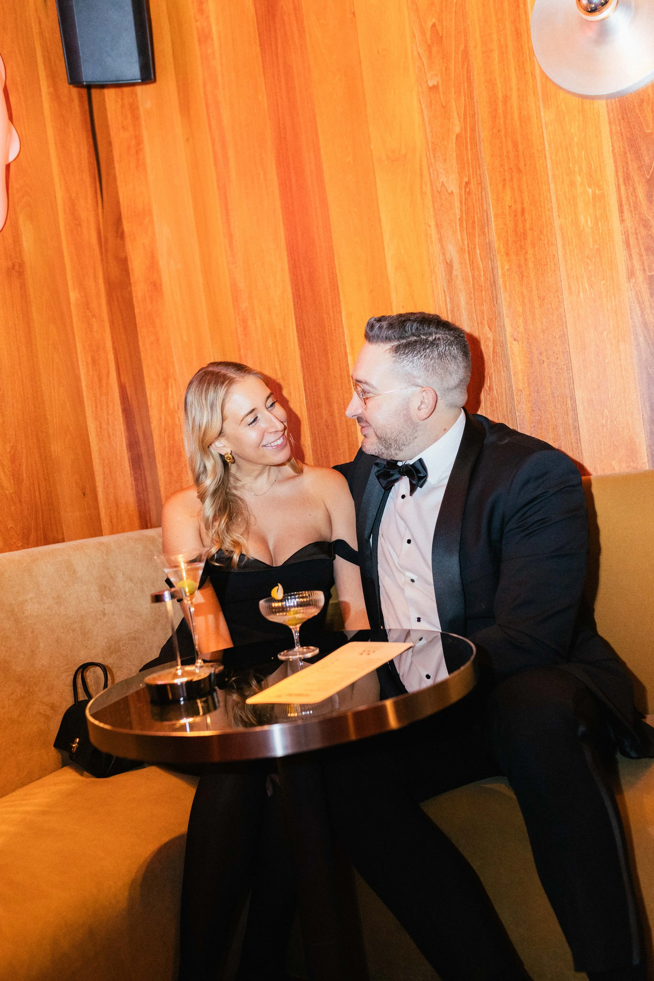A woman in a black dress and a man in a tuxedo are sitting at a small round table, smiling and looking at each other, in a dimly lit lounge or restaurant with wood-paneled walls. View fullsize