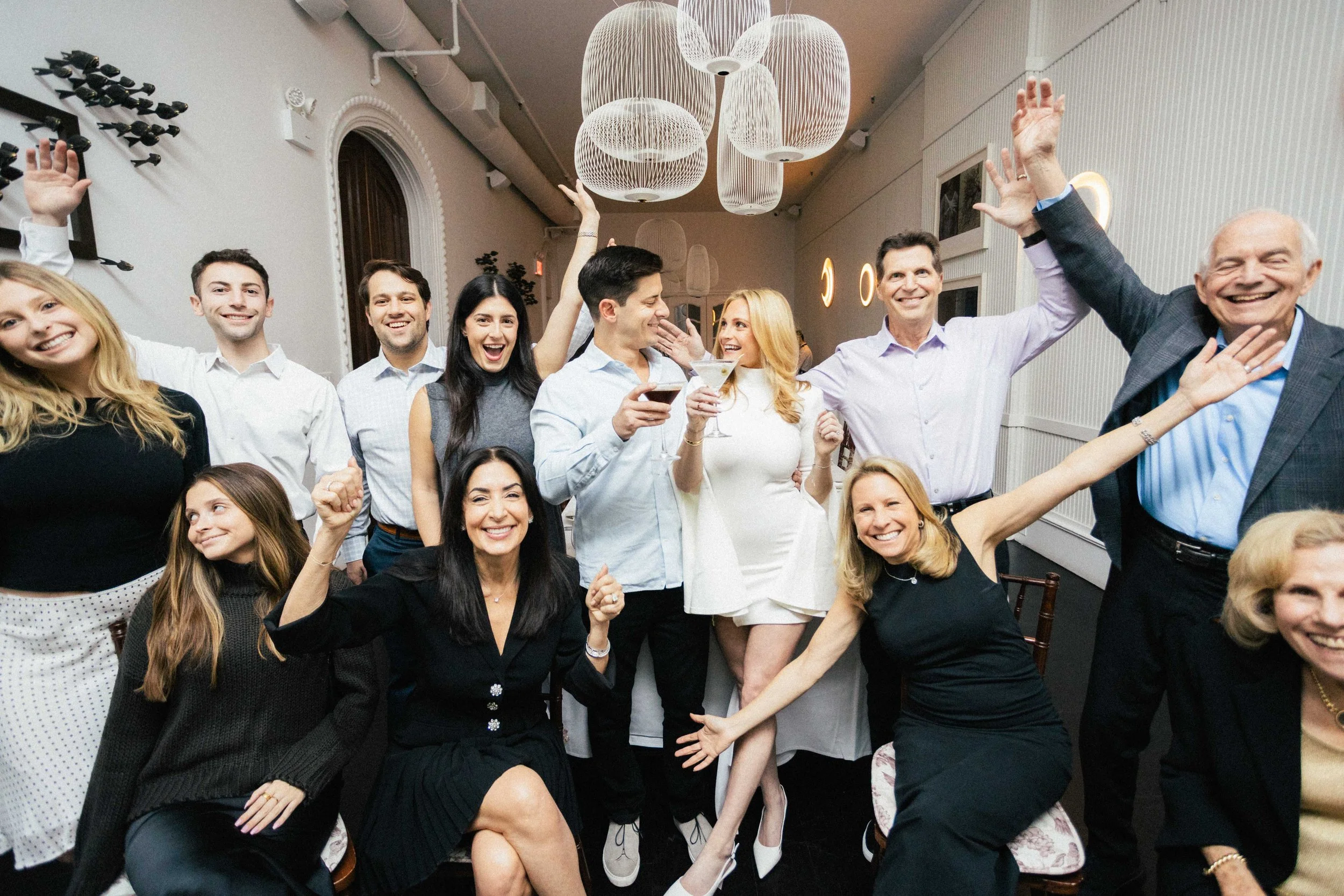A diverse group of people celebrating at a party, smiling, raising glasses, and posing for a photo indoors with modern decor and hanging light fixtures. View fullsize