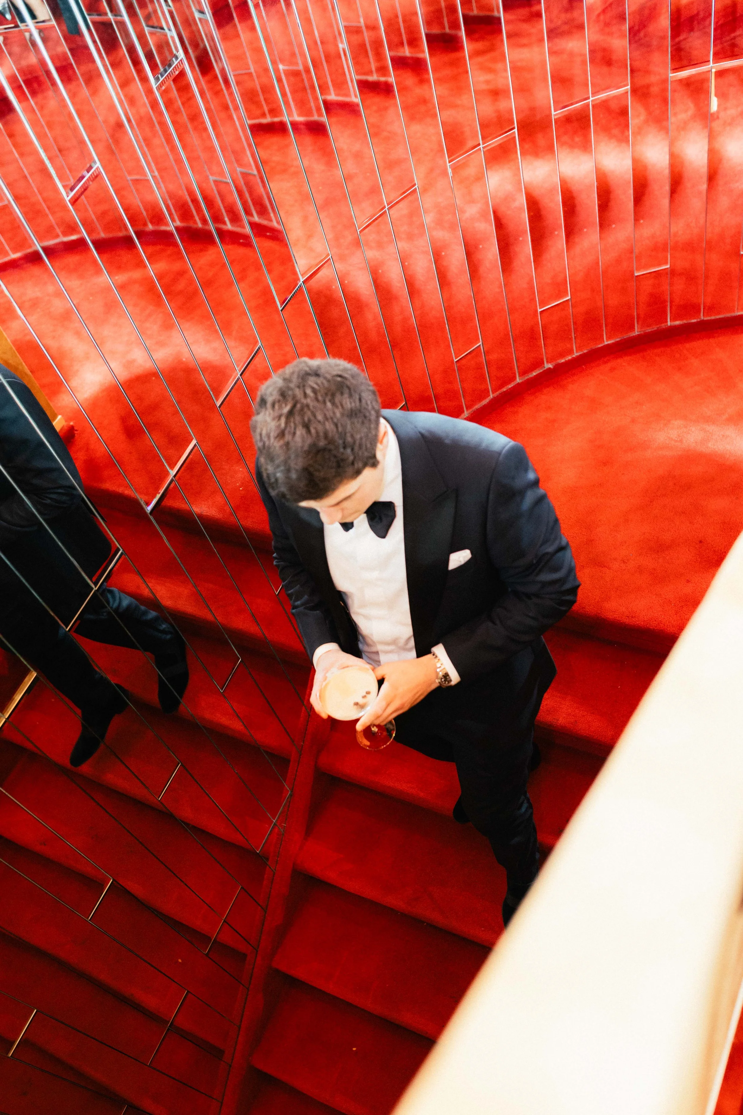 A man in a tuxedo holding a drink, seen from above, walking down red-carpeted stairs with a red wall and gold railing. View fullsize