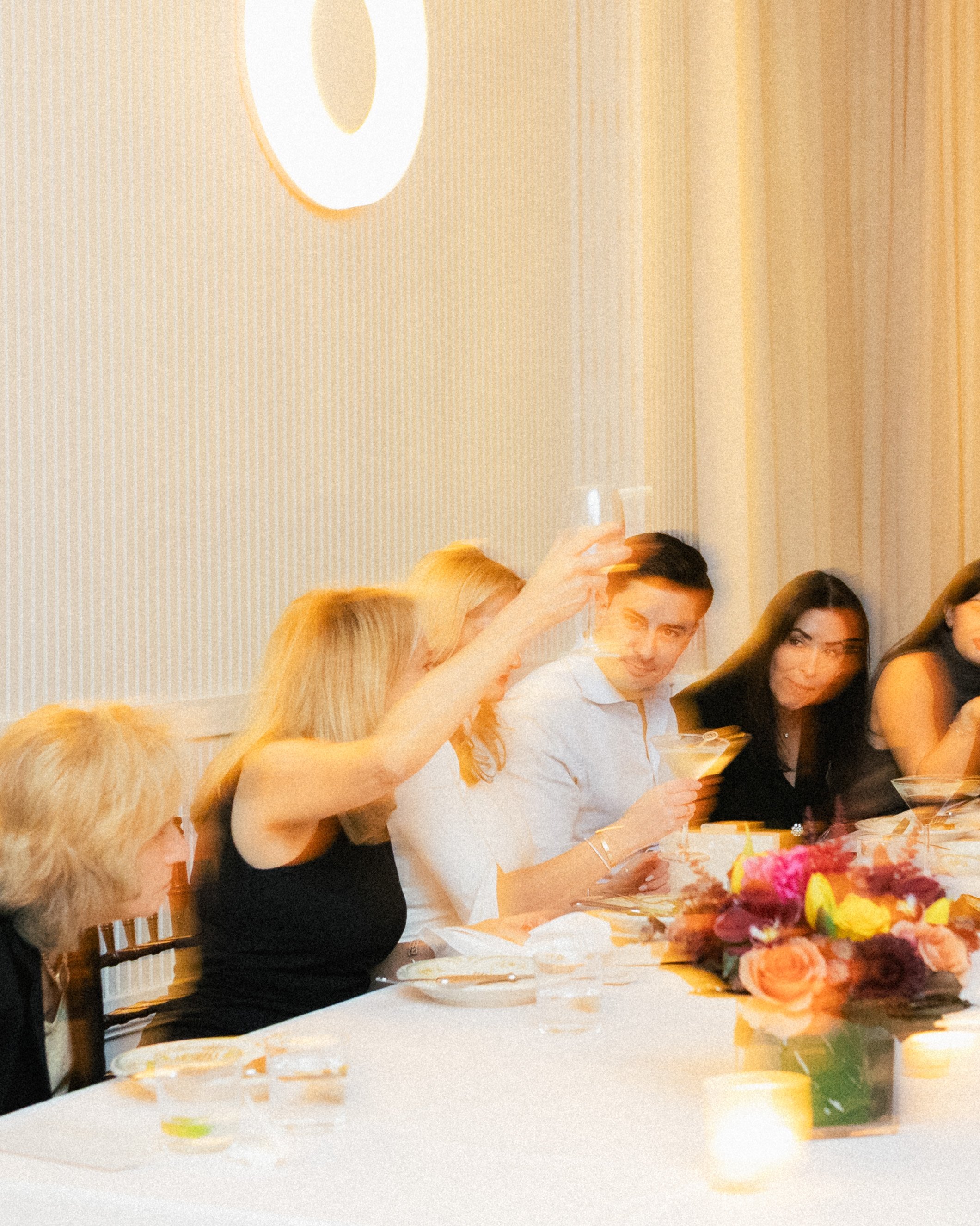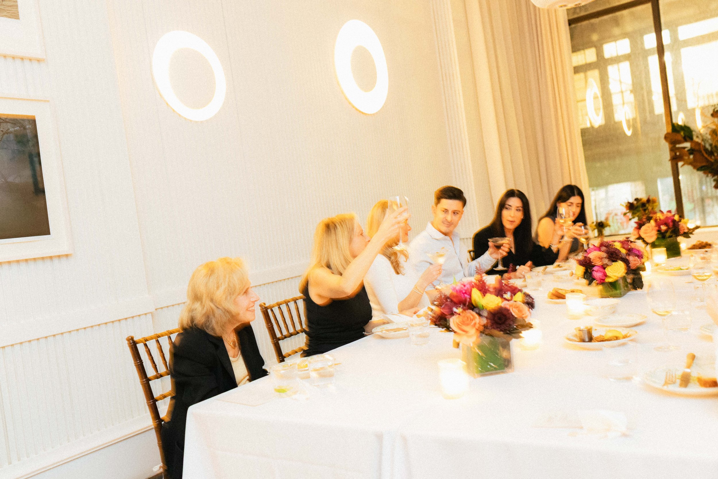 People sitting at a long table with floral centerpieces, raising glasses for a toast in a well-lit dining room.