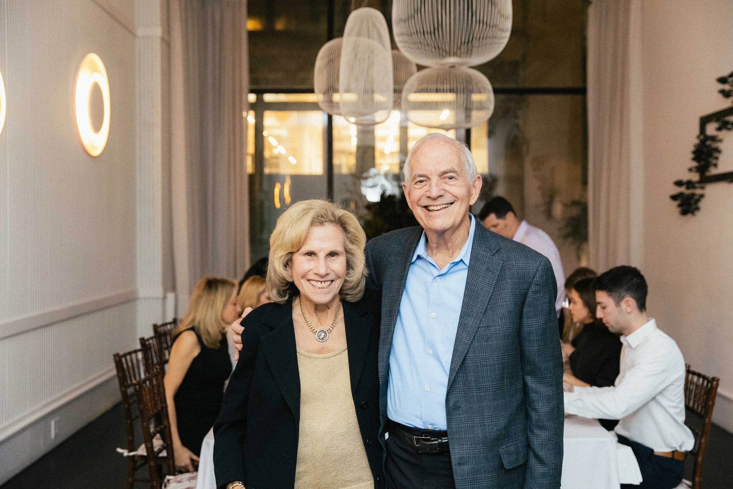 An elderly couple smiling at a dinner event, standing in front of a group of seated people in a dining room with modern hanging lights and large windows.