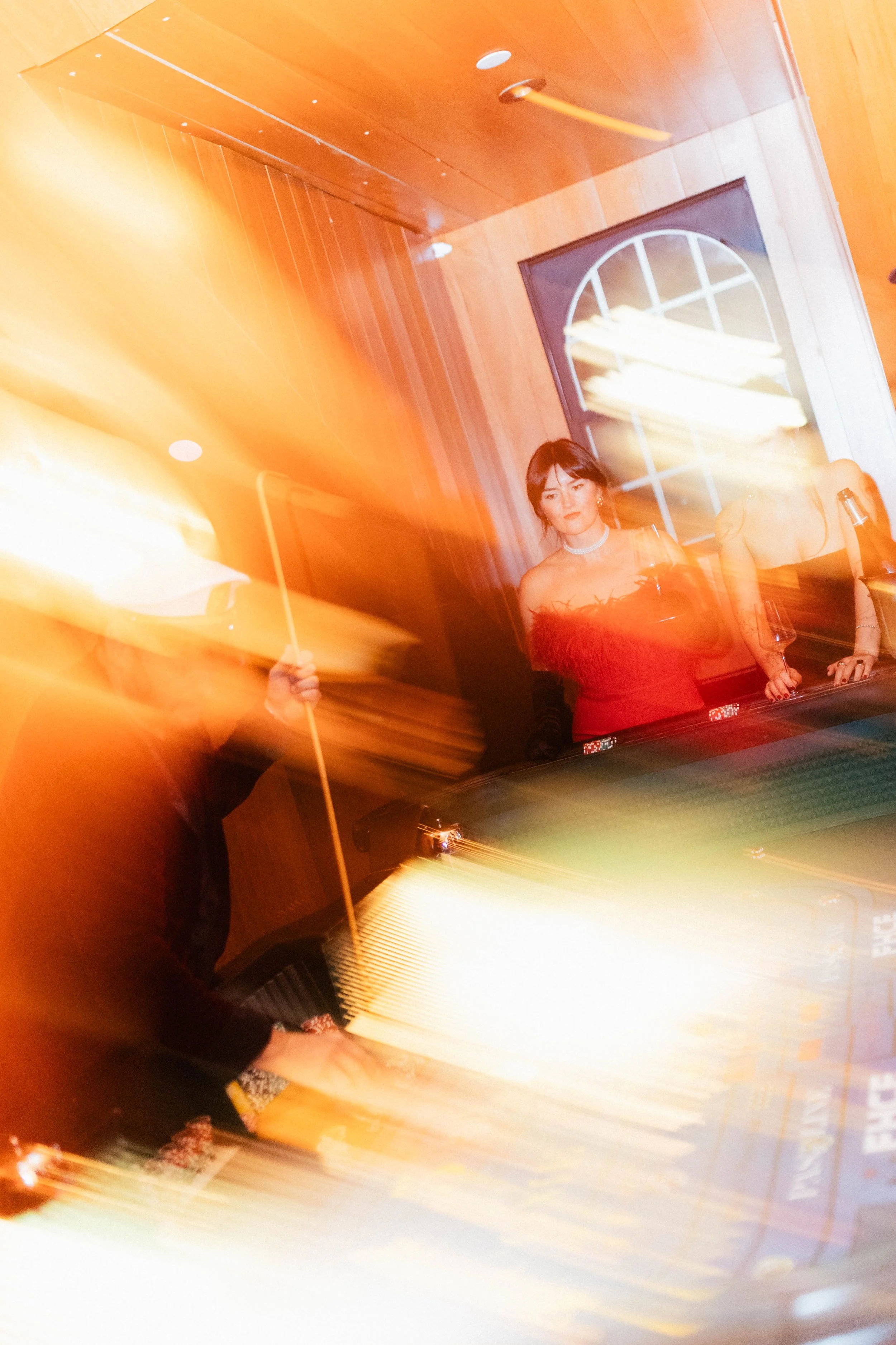 People at a party or social gathering in a room with wooden walls, some with drinks, and a woman in a red off-the-shoulder dress. There is motion blur and light streaks in the image. View fullsize