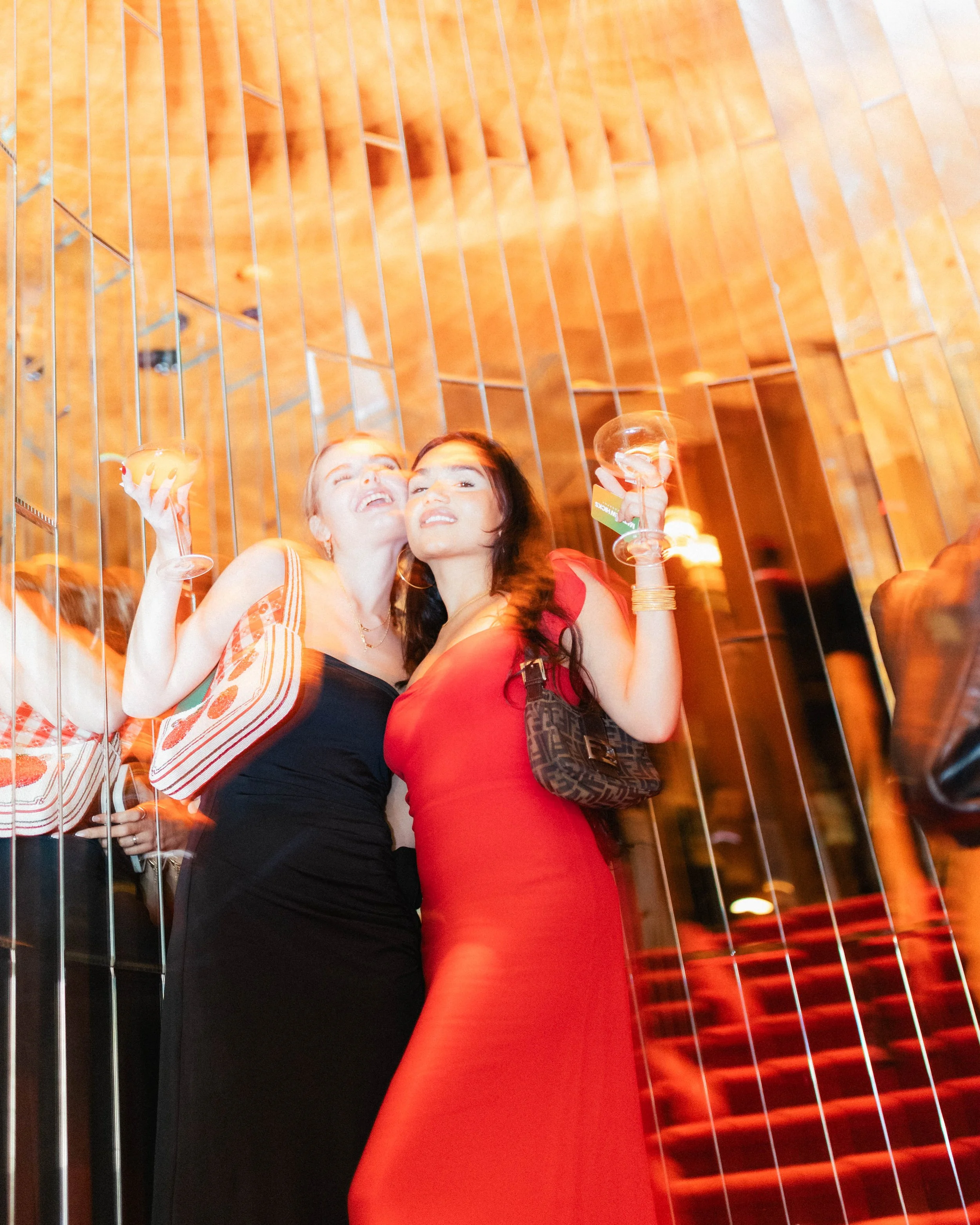 Two women celebrating with drinks at a party or event, standing in front of a mirrored wall with warm lighting.