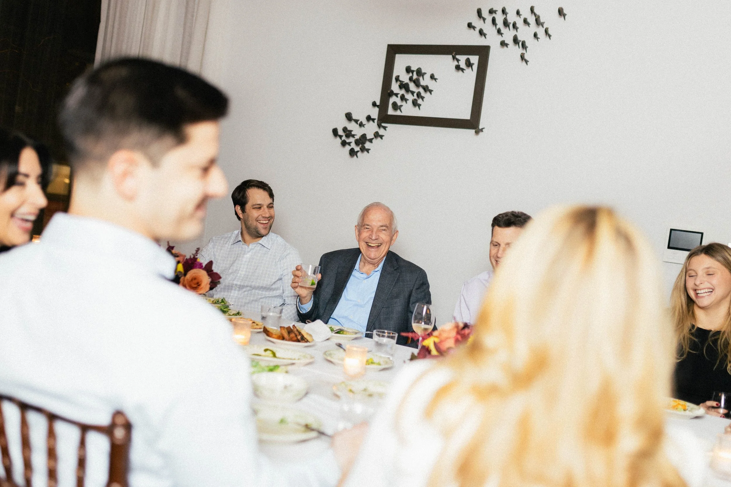 A group of people gathered around a dining table, laughing and enjoying a meal, with an elderly man in the center holding a glass, in a well-lit room with white walls decorated with black wall art.