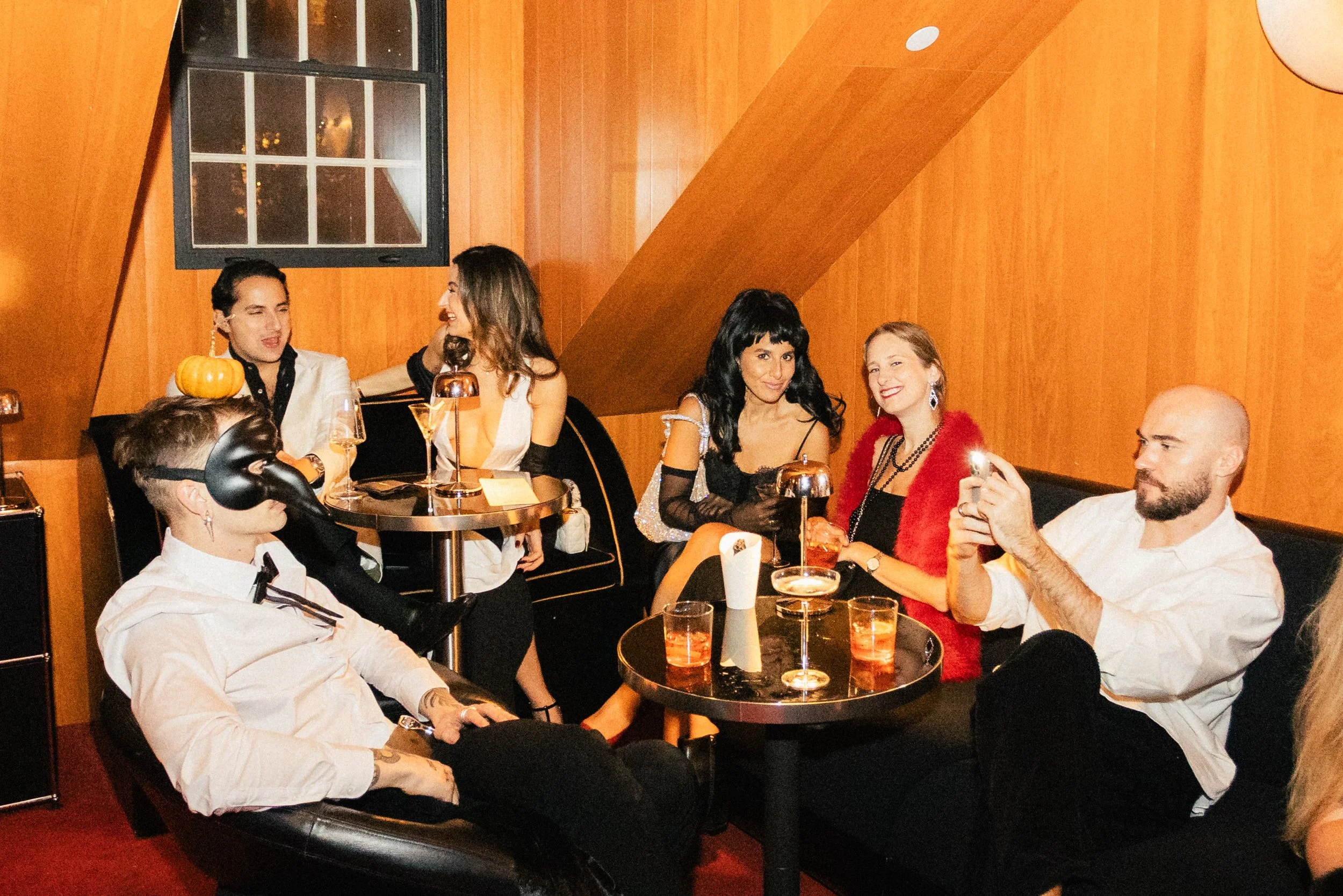 Group of six adults at a party or celebration in a warmly lit room with wooden walls, some wearing costumes or fancy attire, sitting or lounging around small tables with drinks. View fullsize