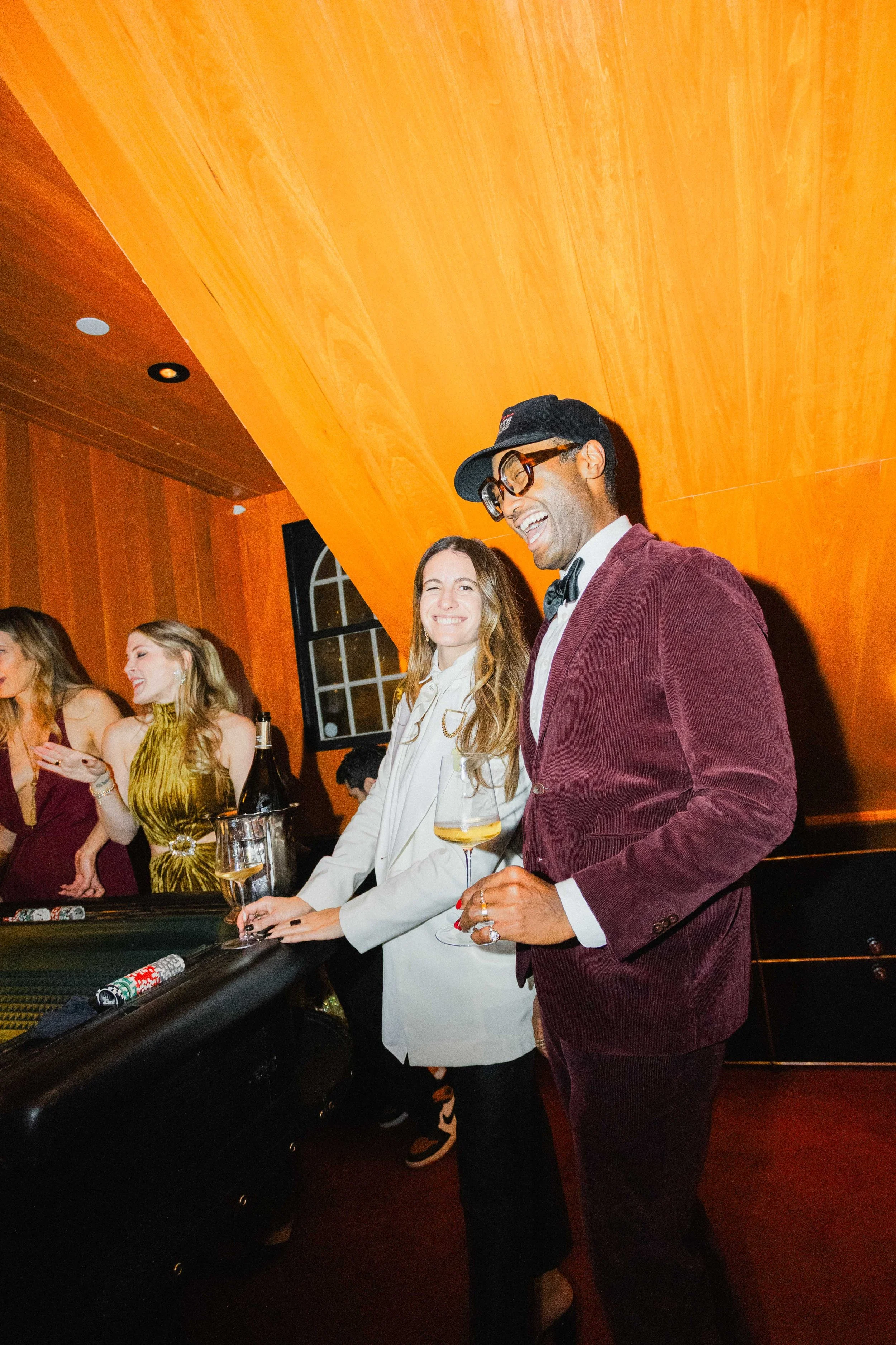 A group of people dressed in formal attire enjoying themselves at a party, with some playing poker and holding drinks, in a room with wood-paneled walls.
