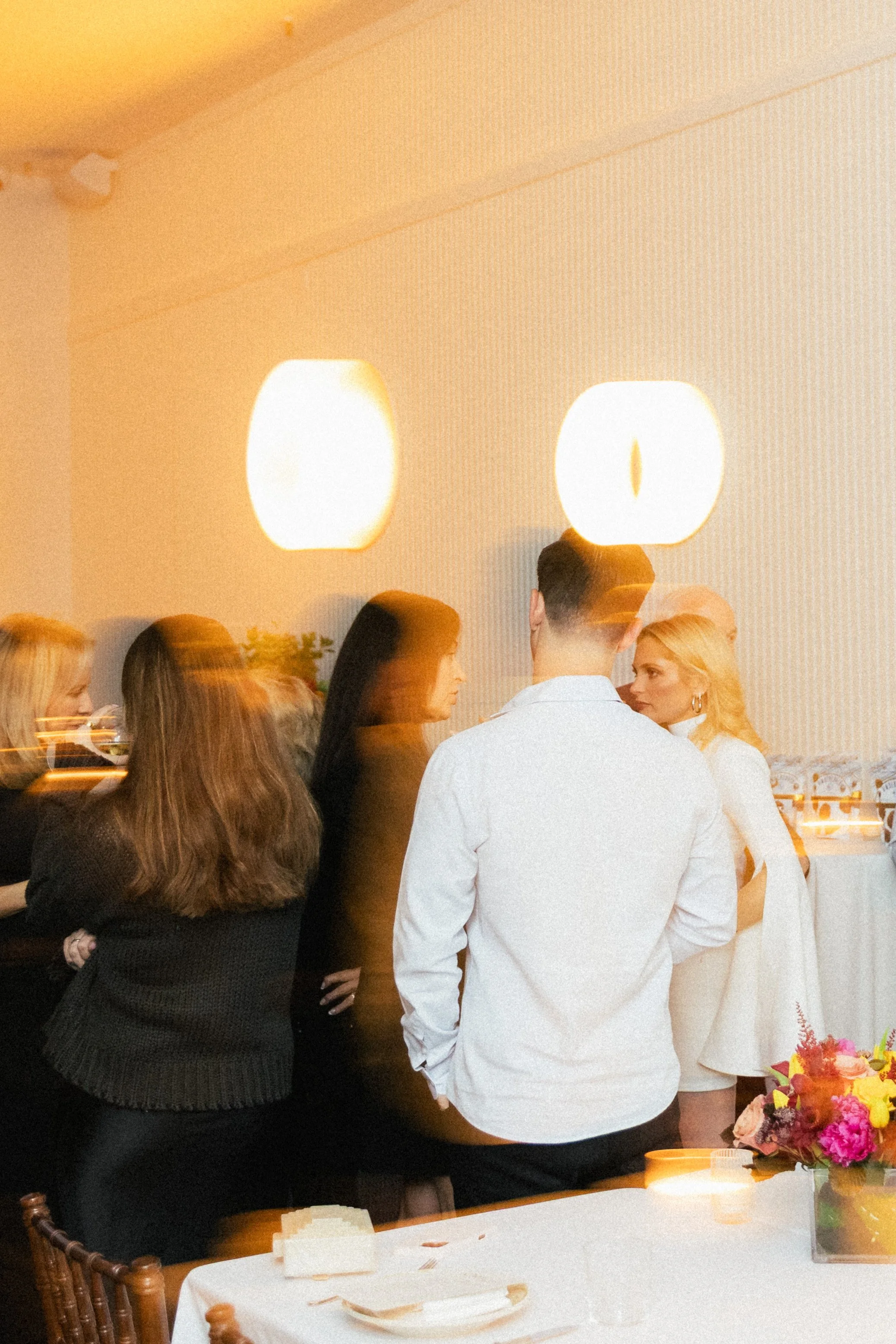Two women with blonde hair in conversation at a lively party, with warm orange lighting and blurred motion.