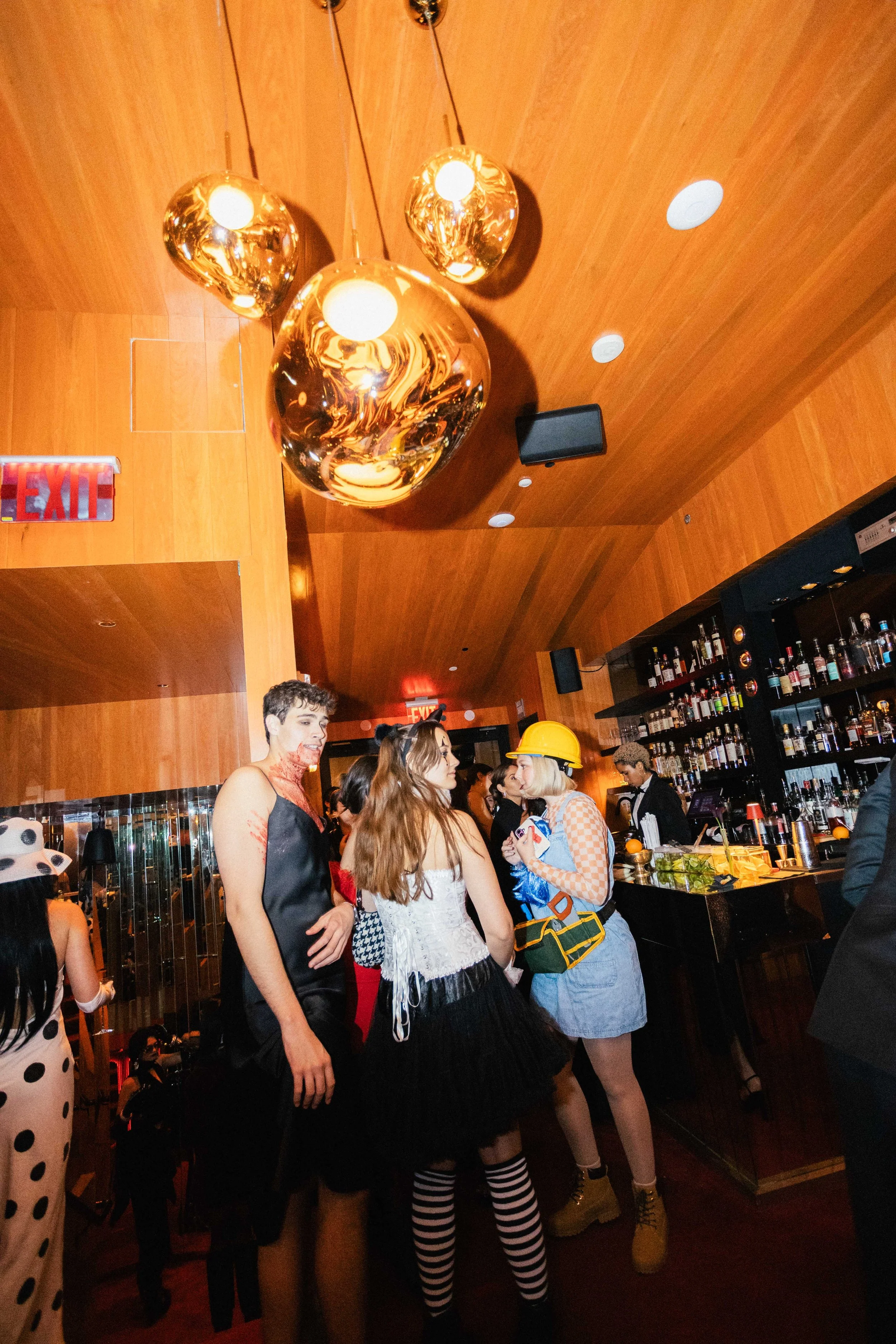 People dressed in costumes at a bar, with a woman dressed as a construction worker and others in various outfits, wooden ceiling with modern lighting fixtures, shelves with liquor bottles.
